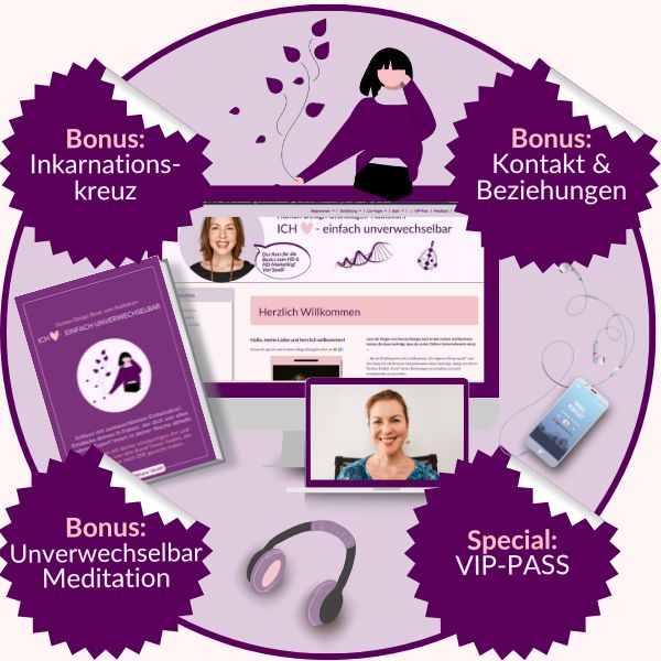 ABER: Wie du vielleicht schon im Bonusbereich gesehen hast🥰, gibt es den VIP-Pass: Du sicherst dir durch die Buchung von „ICH 💗 – einfach unverwechselbar“ einen 10%-Rabatt auf meine 1:1-Human Design-Readings.